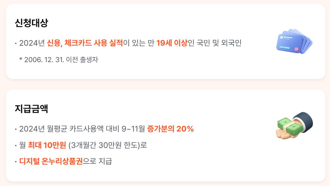 만 19세 이상으로 본인 명의 카드를 가지고 있고, 지난해 동일 기간(예: 2024년 9월~11월)에 카드 사용 기록이 있는 사람이라면 신청 대상이 됩니다. 신용카드/체크카드 모두 가능하며, 외국인도 국내 사용 실적이 있다면 신청할 수 있습니다.
